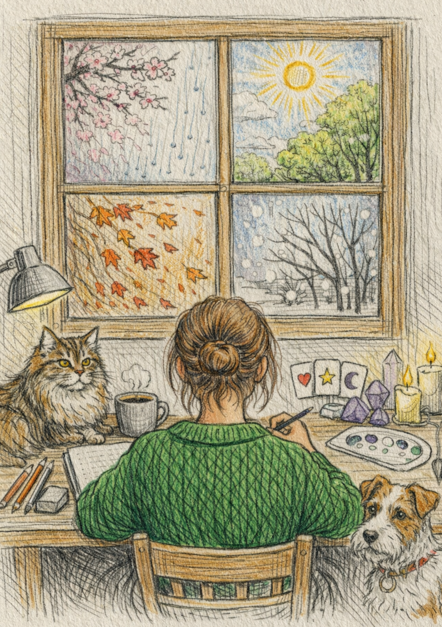 C’est un lieu où se croisent images, saisons et intuition. J’y propose des illustrations, des échos saisonniers et des tirages intuitifs pensés comme des moments pour soi.