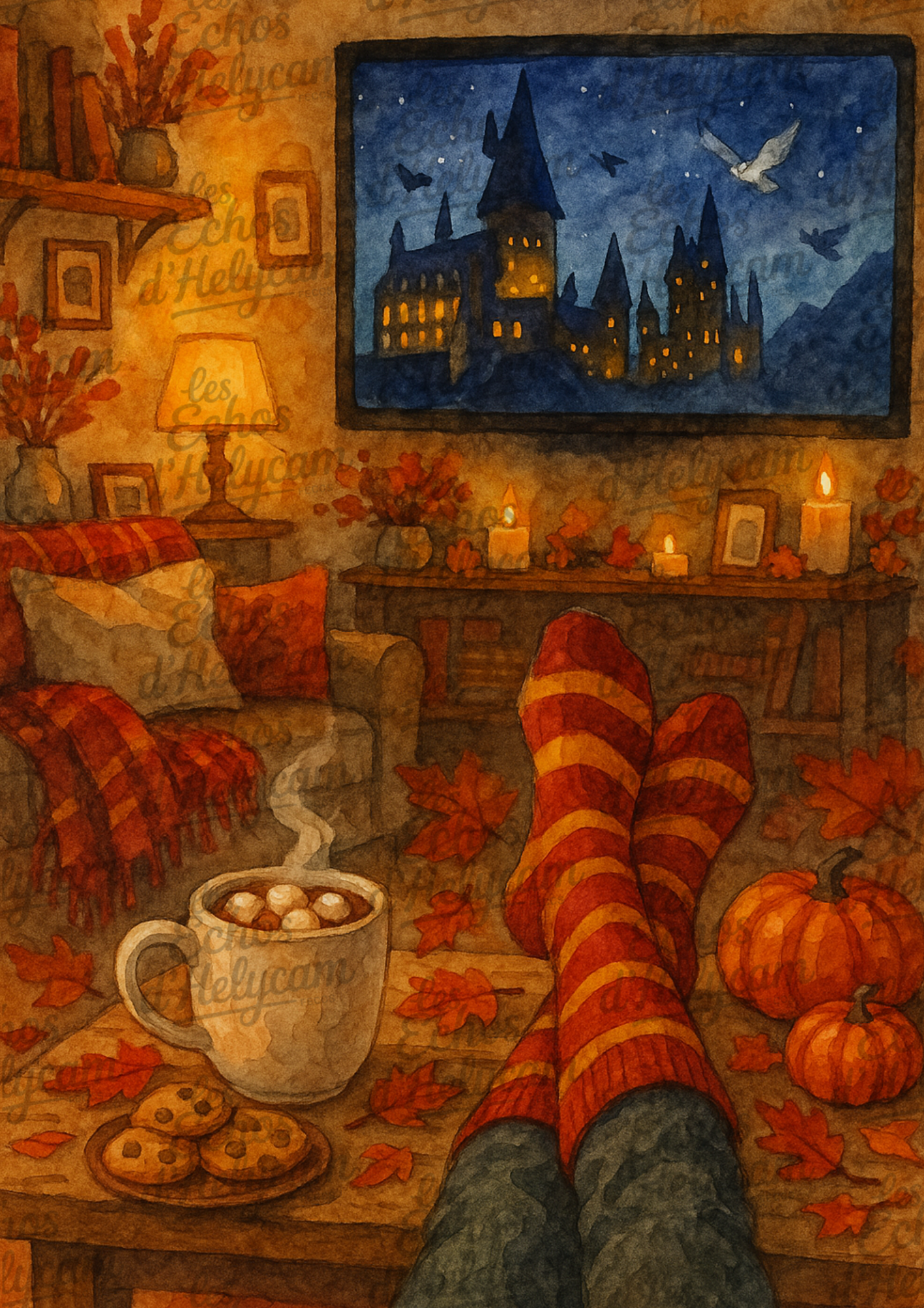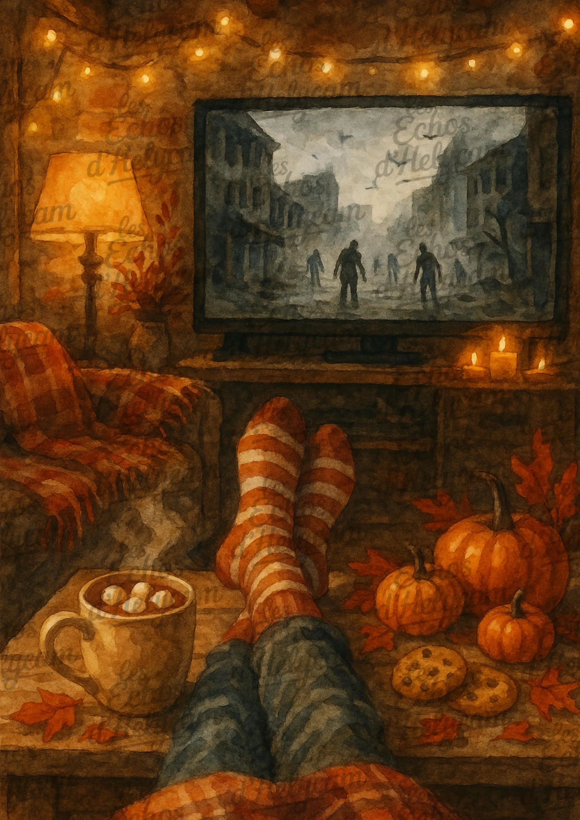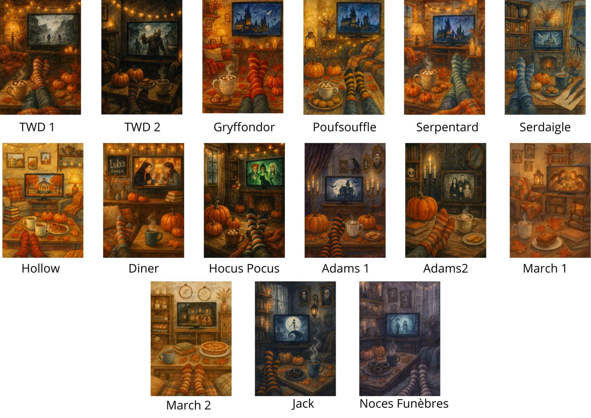 Ces affiches sont nées de cette atmosphère toute douce : un salon chaleureux, des guirlandes lumineuses, des citrouilles… et à l'écran, vos univers préférés.