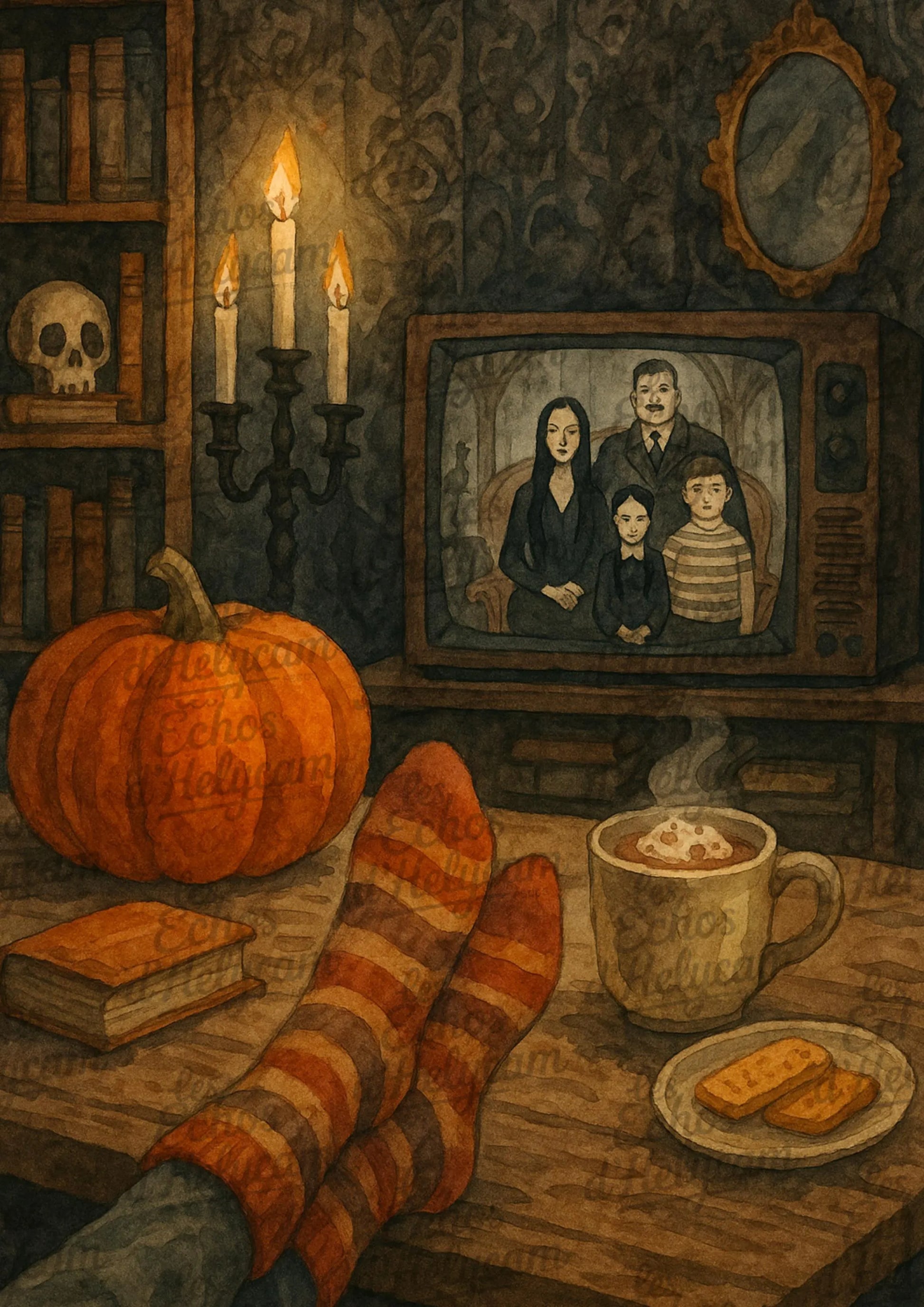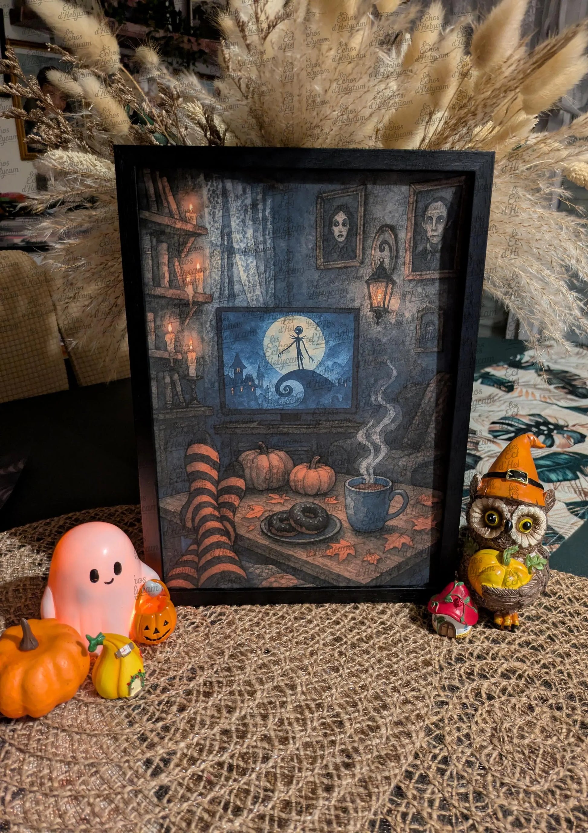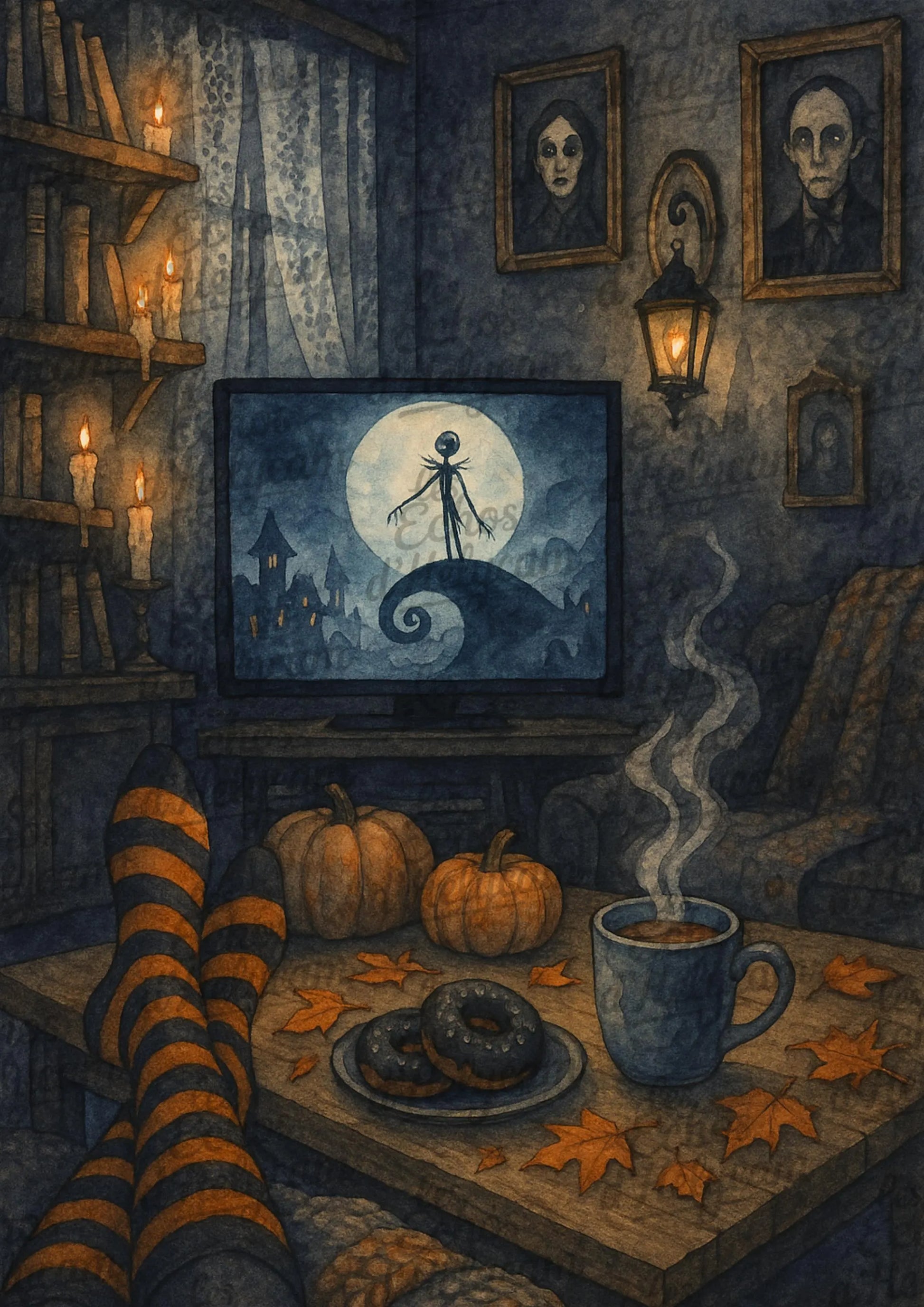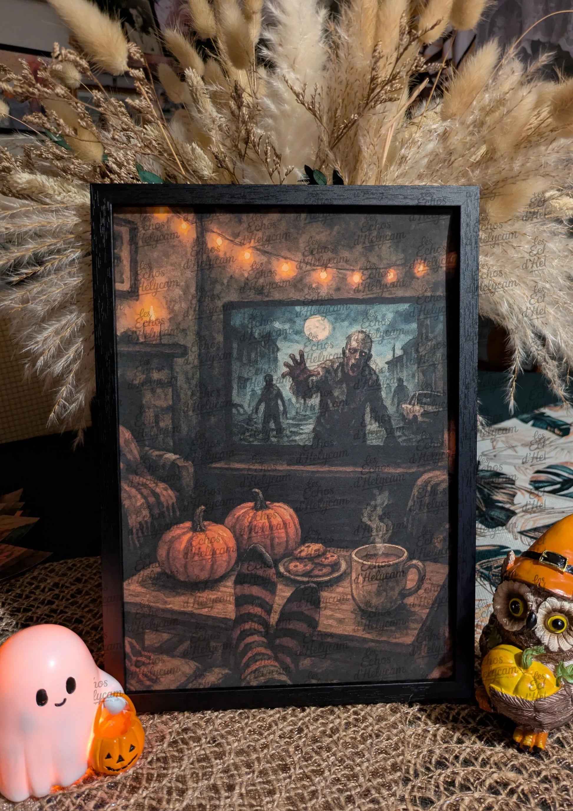 Ces affiches sont nées de cette atmosphère toute douce : un salon chaleureux, des guirlandes lumineuses, des citrouilles… et à l'écran, vos univers préférés.