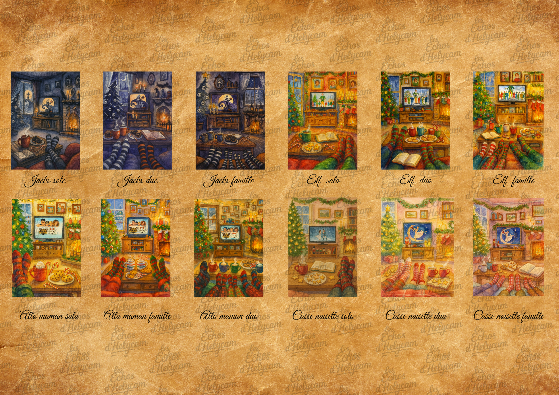 Plongez dans la magie des fêtes avec cette illustration unique. Chaque affiche met en scène une ambiance hivernale et cocooning : un salon illuminé par le feu de cheminée, un sapin décoré, une tasse de chocolat chaud fumant… et à l’écran, un film de Noël culte qui nous rassemble tous chaque hiver.