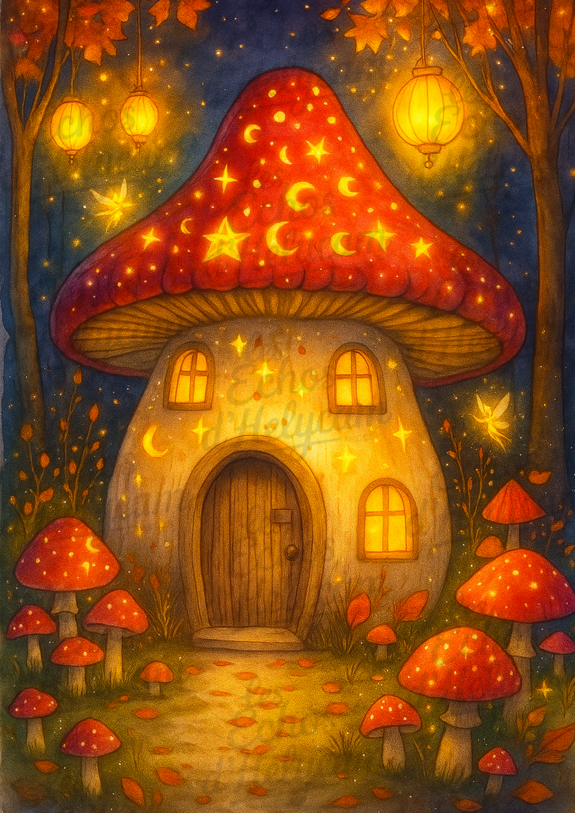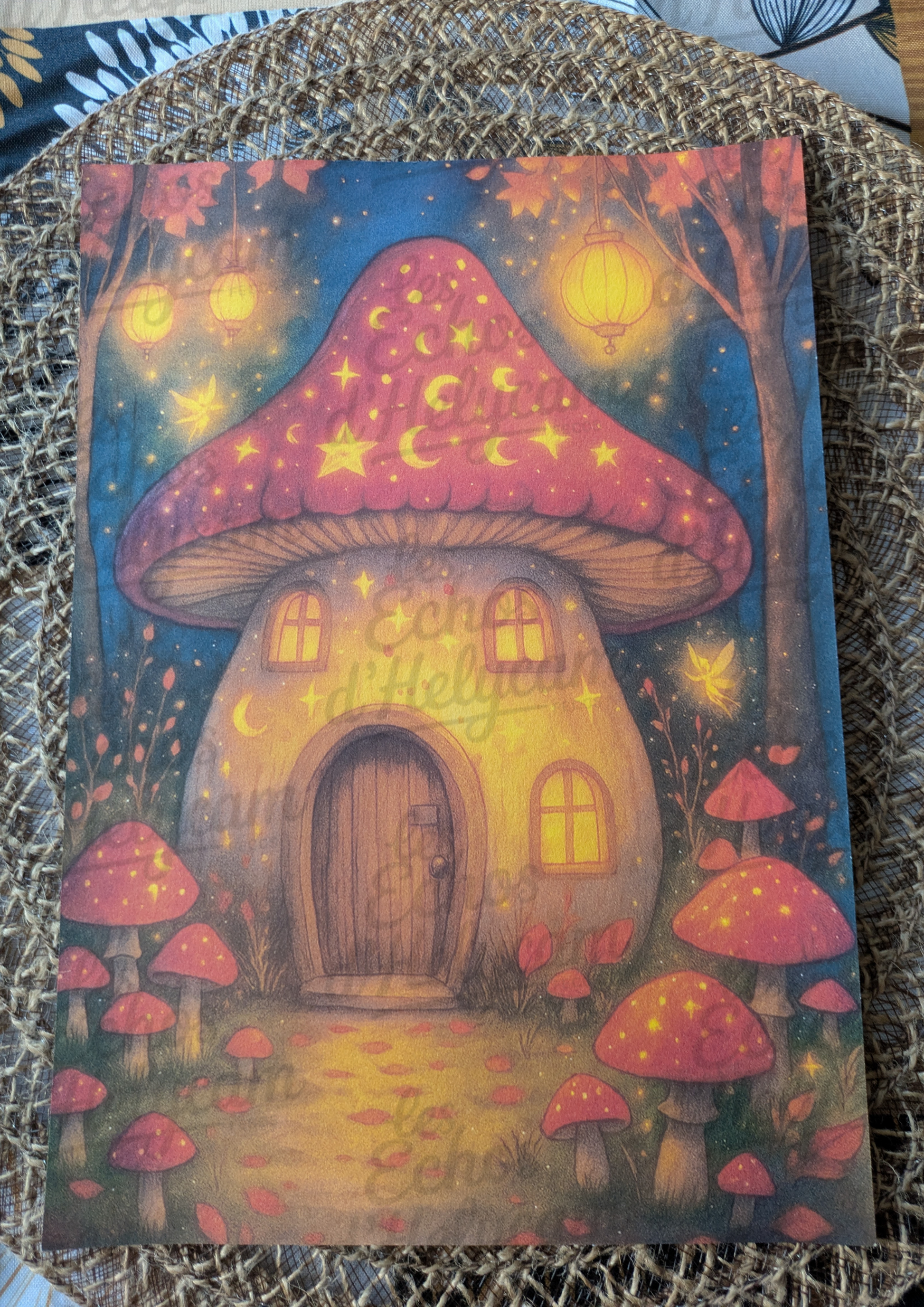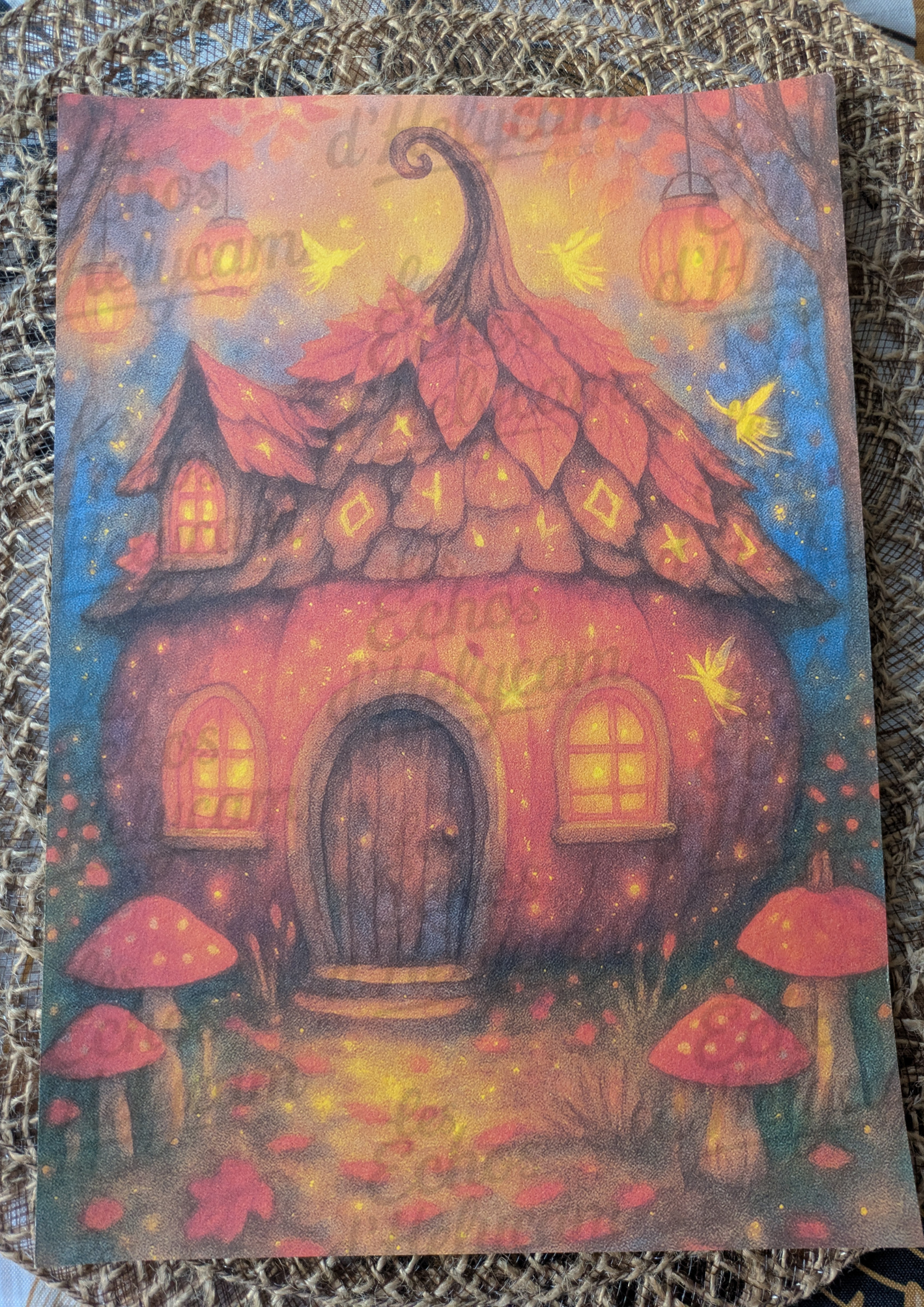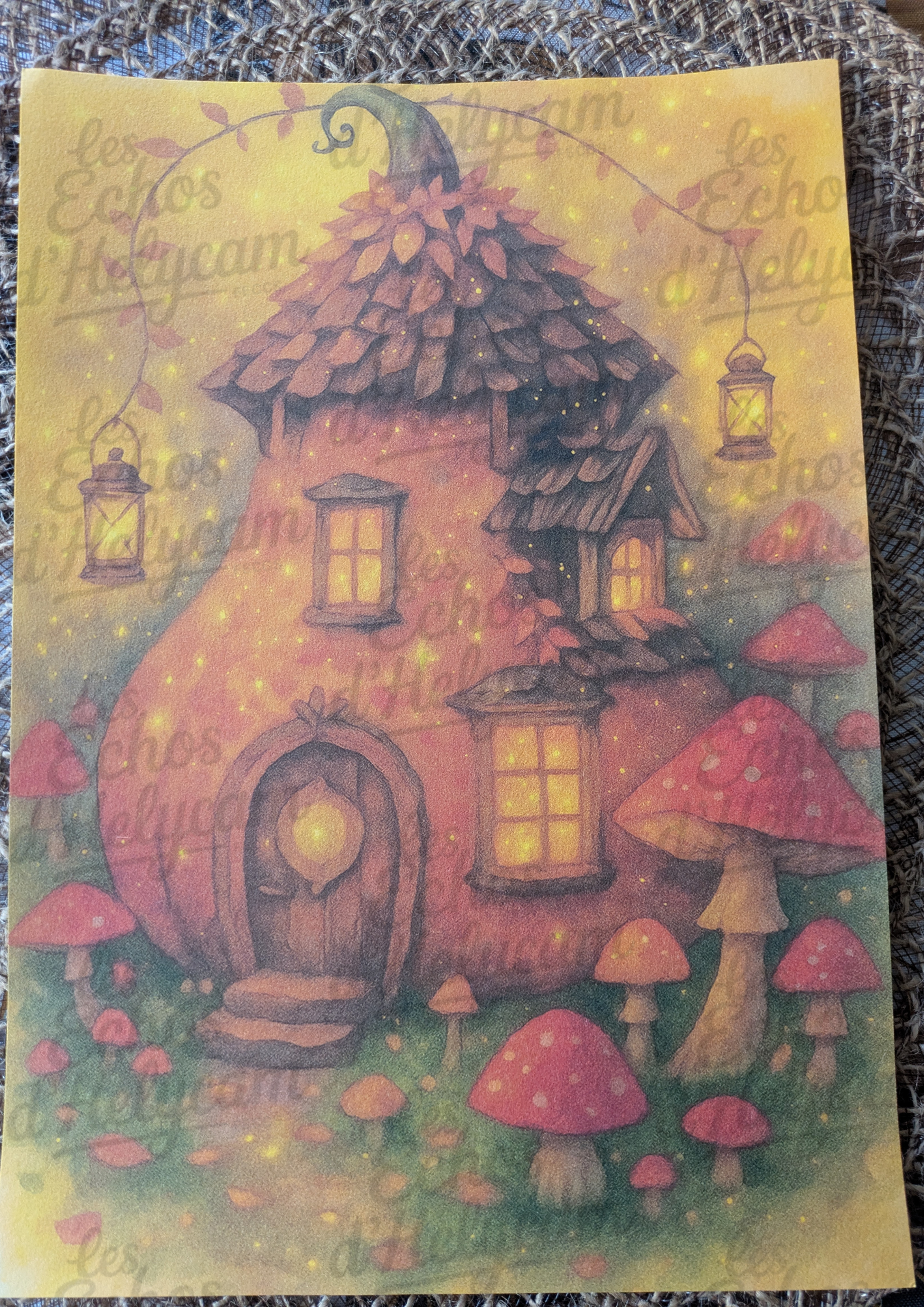 Chaque maison féérique est imprimée en format A4 sur papier mat épais, pour un rendu artisanal et chaleureux qui rappelle l’aquarelle peinte à la main.