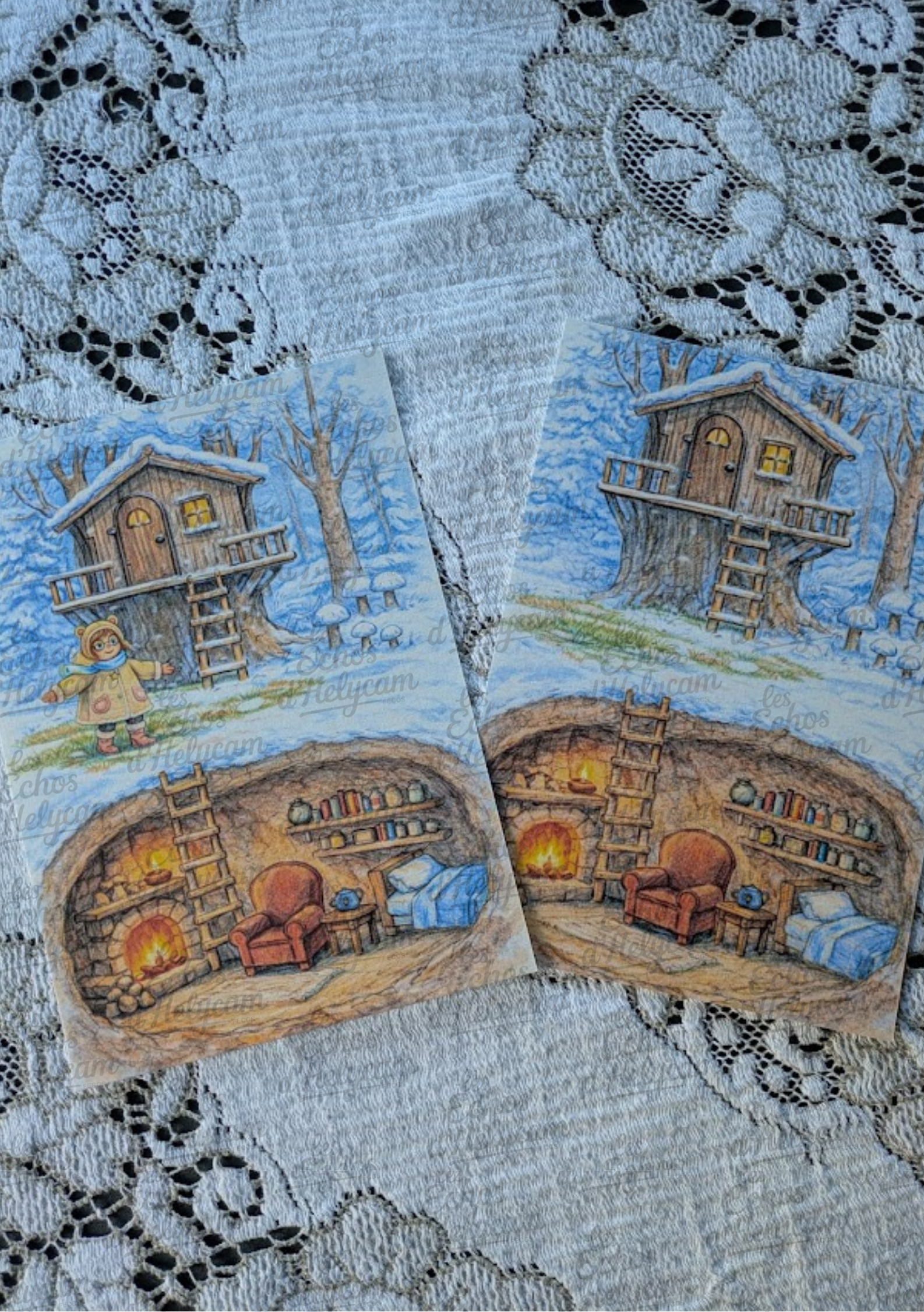 Cette illustration représente une cabane nichée dans les arbres, sous la neige, et son refuge secret souterrain, éclairé par le feu de cheminée. Un lieu imaginaire, rassurant, où l’on devine le silence de l’hiver et la chaleur d’un foyer.