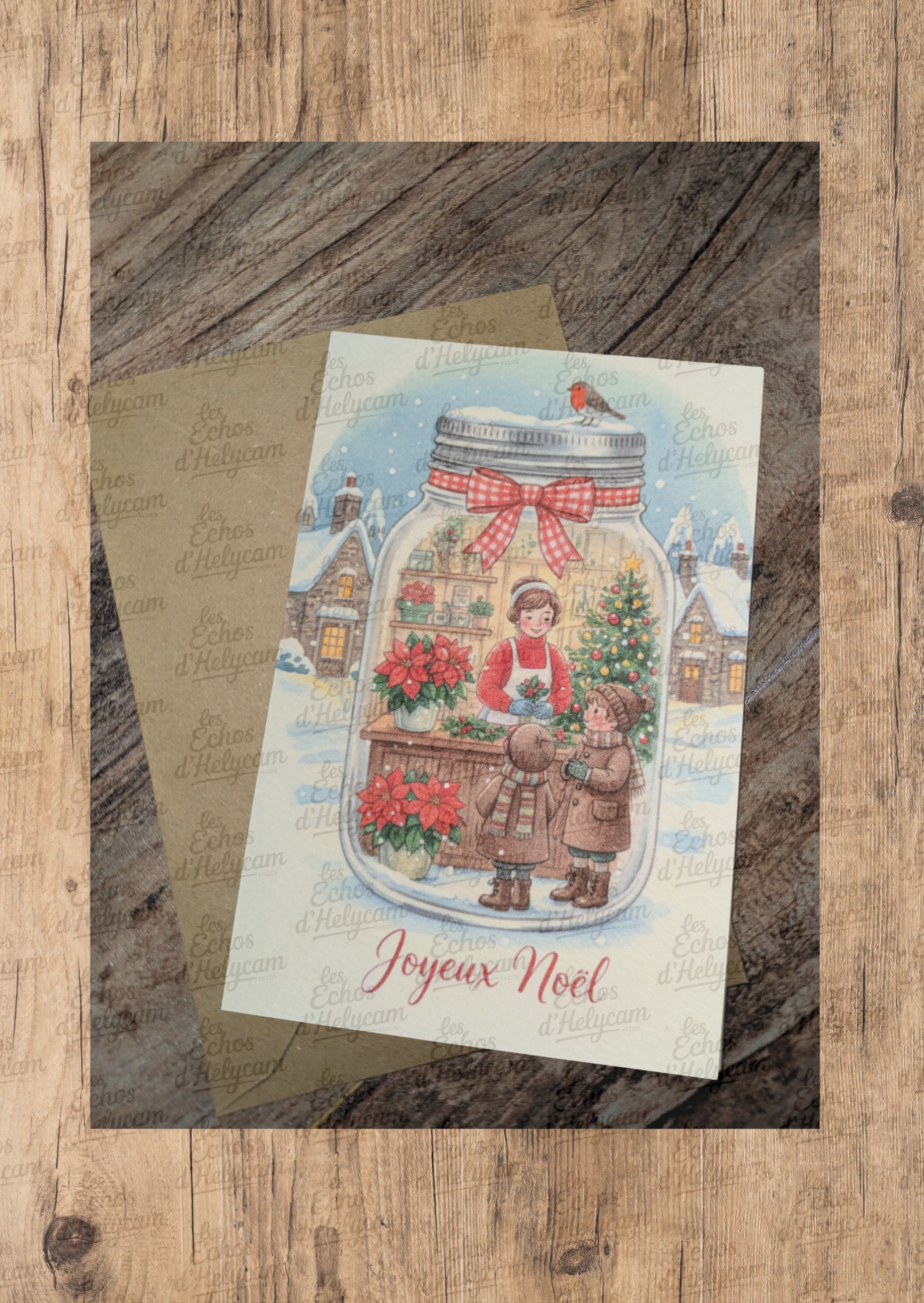 Un joli lot de 6 cartes de vœux sur le thème de Noël, représentant de petites vitrines d’époque illustrées dans un style aquarelle vintage : la boulangerie, la confiserie, la mercerie, la librairie, la chapellerie et le fleuriste.